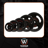 وزنههای دور لاستیک وینرگروپ در سایزهای مختلف تولید میشوند تا پاسخگوی نیاز تمامی ورزشکاران در تمرینات قدرتی، پرس، اسکوات و ددلیفت باشند.