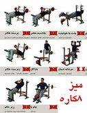 حرکات: ۱-پرس سینه ۲-بالا سینه ۳-زیر سینه ۴-شکم ۵-پارالل ۶-جلوپا ۷-پشت پا ۸-سرشانه