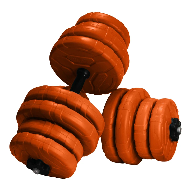 ست فوق همراه با یک جفت دسته دمبل آهنی با چهار عدد مهره ستاره ای فلزی با روکش از جنس پلی پروپیلن میباشد .