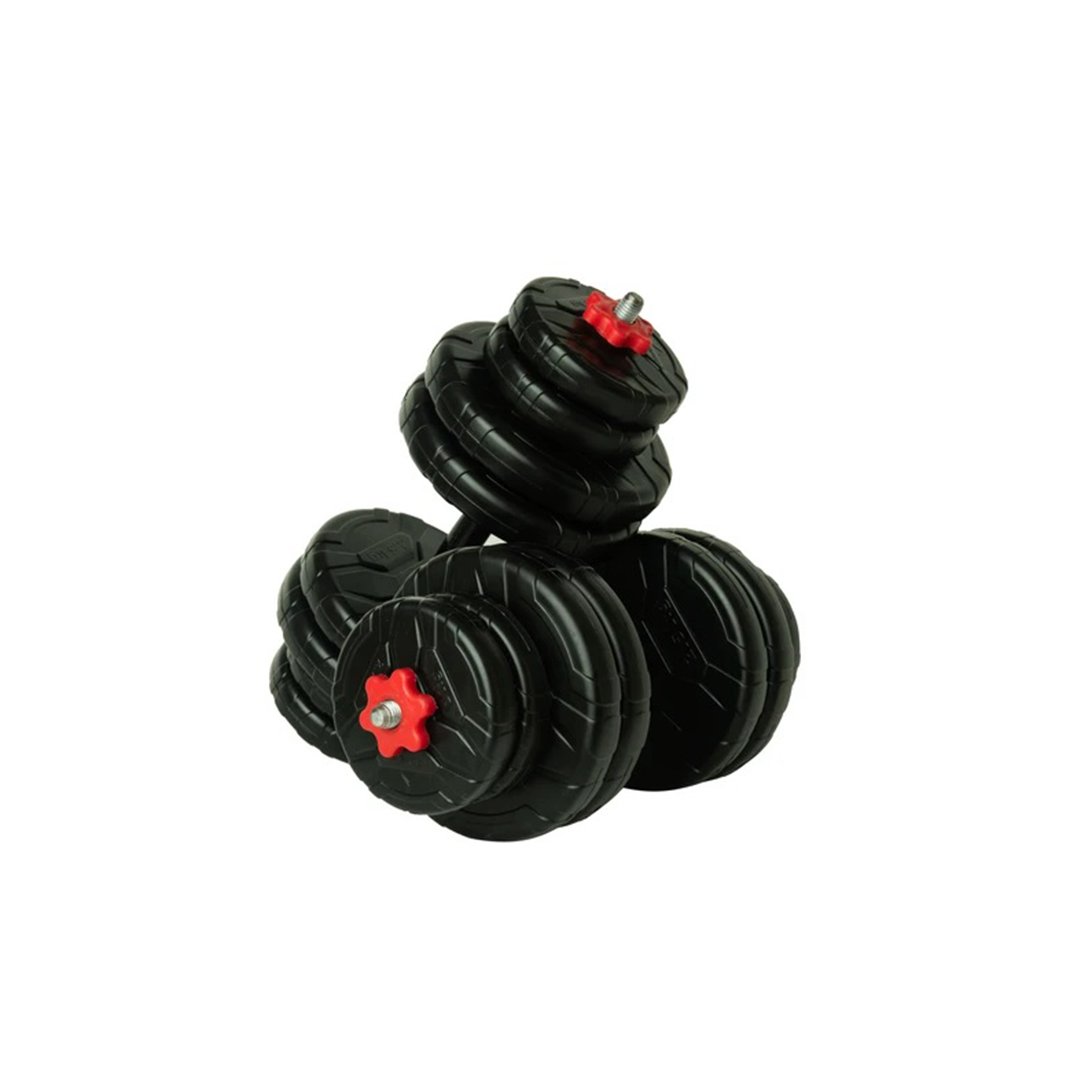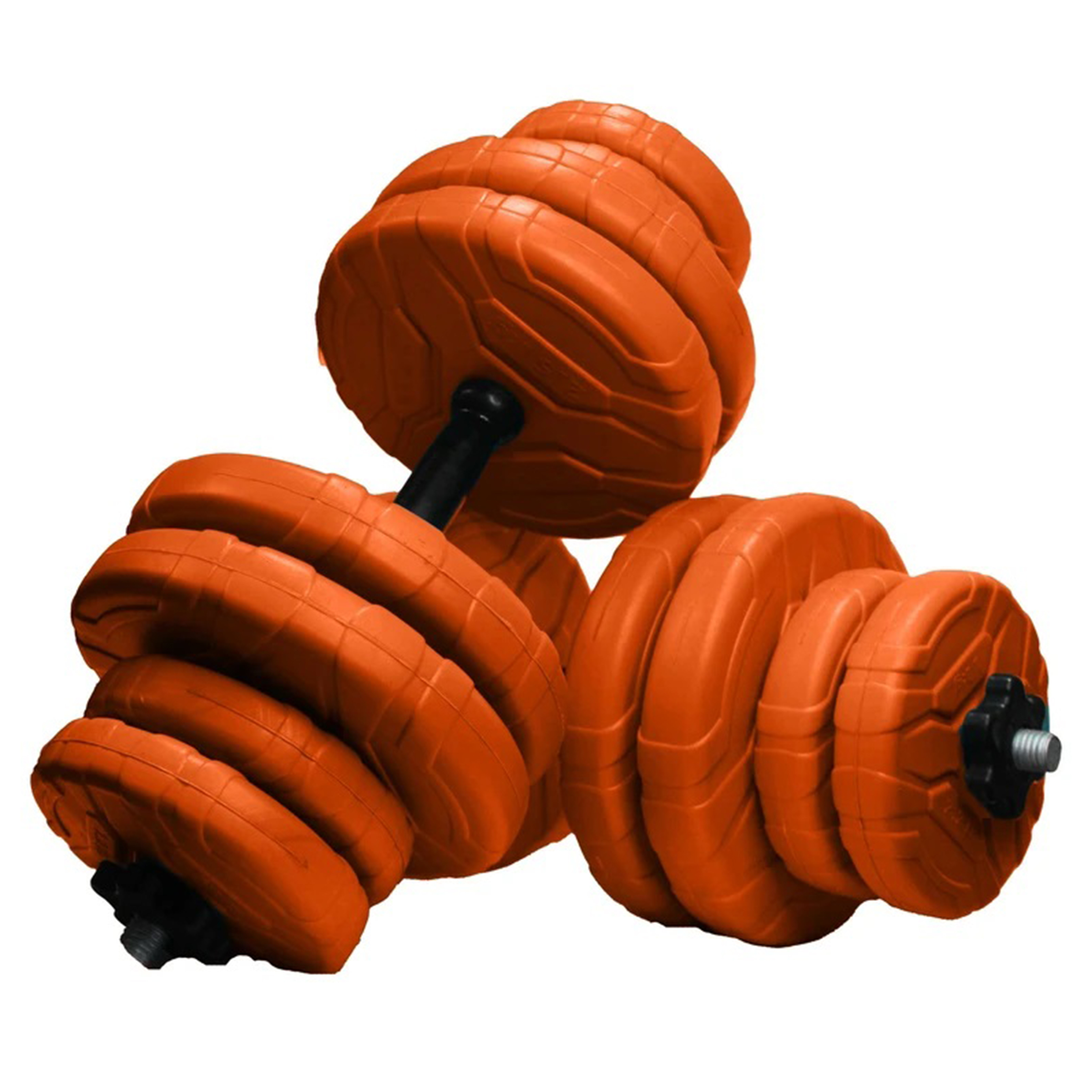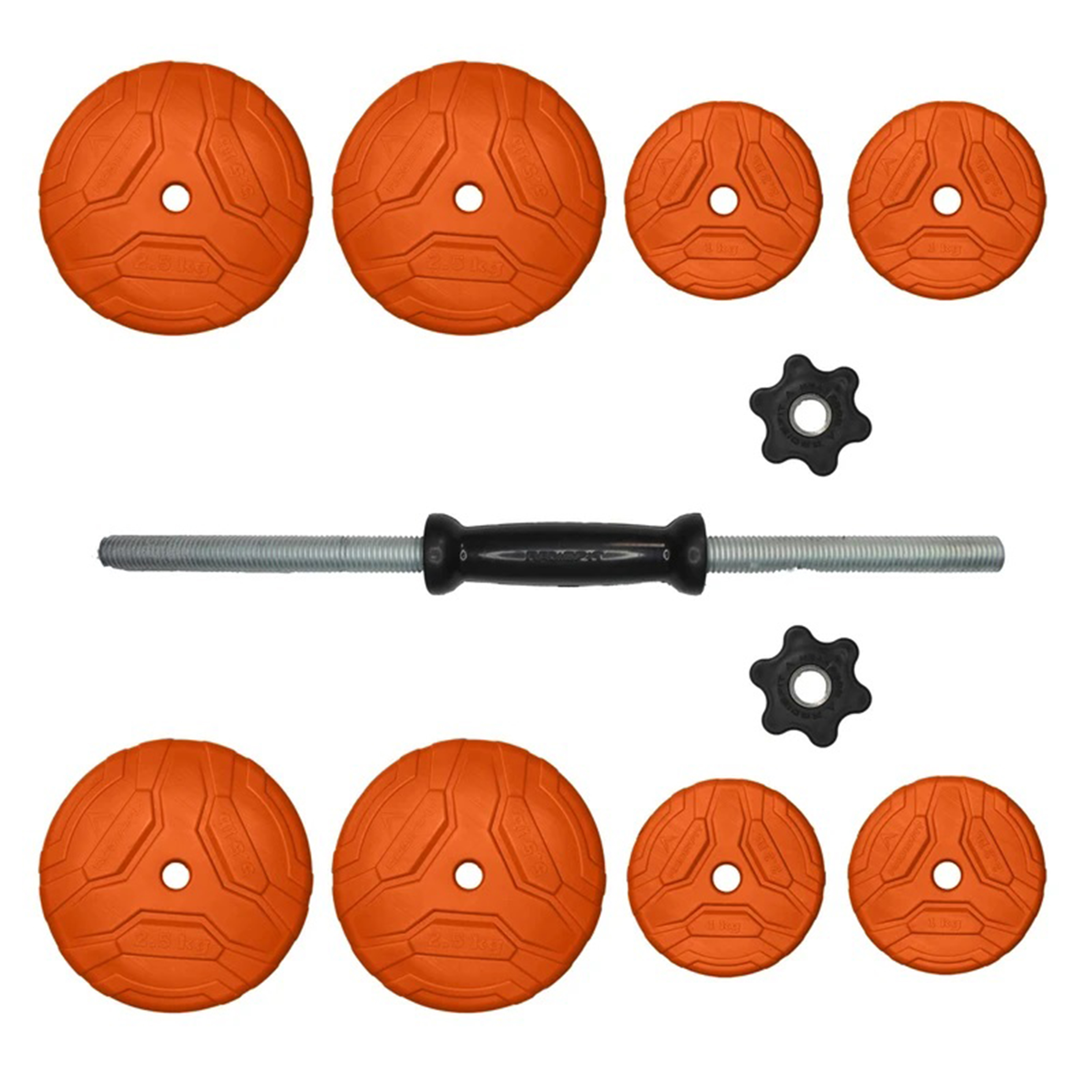 ست فوق همراه با یک جفت دسته دمبل آهنی با چهار عدد مهره ستاره ای فلزی با روکش از جنس پلی پروپیلن میباشد .
